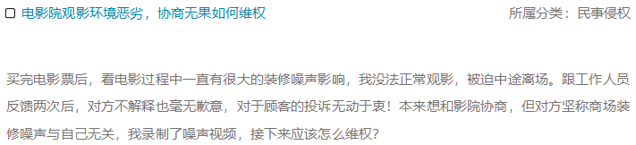 买完电影票后,看电影过程中一直有很大的装修噪声影响,我没法正常观影,被迫中途离场。跟工作人员反馈两次后,对方不解释也毫无歉意,对于顾客的投诉无动于衷!本来想和影院协商,但对方坚称商场装修噪声与自己无关,我录制了噪声视频,接下来应该怎么维权?