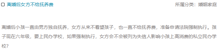 离婚后小孩一直由男方独自抚养,女方从来不看望孩子,也一直不给抚养费,准备申请法院强制执行。孩子现在六年级,要上民办学校。如果强制执行,女方会不会被列为失信人,影响小孩上高消费的私立民办学校?